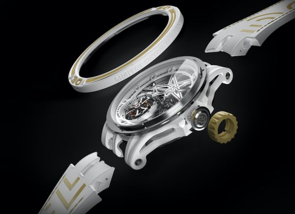 A significant undertaking, this feat of advanced mechanics is placed at 7 o’clock on the timepiece, the Roger Dubuis’ signature position. Inspired by the motorsports universe, the masterpiece also displays a power reserve indicator at 9 o’clock that is playfully reminiscent of a car’s fuel gauge.