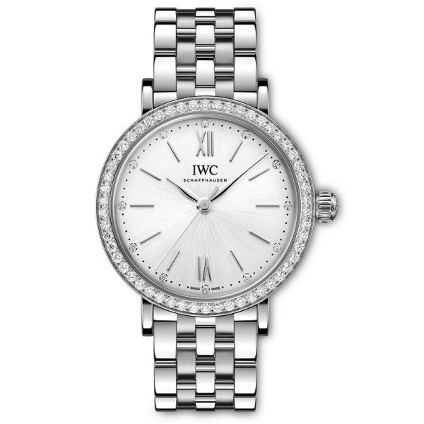 The watch is mounted on a buttery soft blue calfskin strap with a quick-change mechanism and has a face adorned with 12 diamonds and a silver-plated dial with gold-plated hands and accents. Both of these watches are powered by the IWC calibre 35180 automated mechanical movement with central hacking seconds.